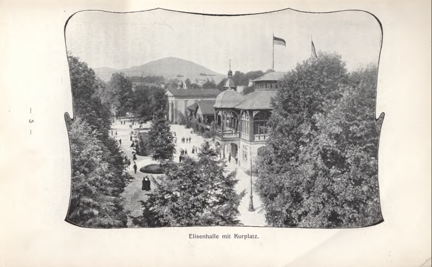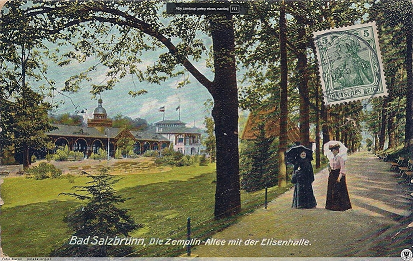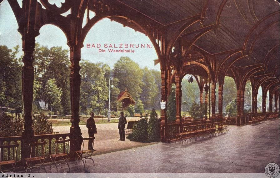 Szczawno Zdrój, dawniej Salzbrunn. widok z hali spacerowej, na pocztówce z napisem "Die Wandelhalle" ok 1905 roku. Źródło: https://polska-org.pl/663465,foto.html