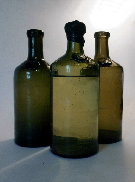 Trzy szklane butelki do transportu wody leczniczej Salzbrunn (Szczawno - Zdrój). Kolekcja Bernd Brinkmann.